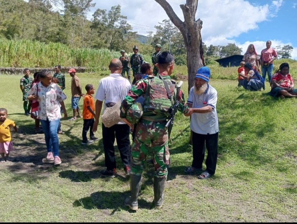 Satgas Yonif 641/Bru melalui tim pengamanan memberikan rasa aman dan damai saat pelaksanaan ibadah minggu berkah, pengamanan ini sebagai bentuk kepedulian atas menciptakannya suasana ibadah dengan tenang bagi masyarakat kampung Polimo, Distrik Kurima, Kab. Yahukimo, Papua Pegunungan (28/07/2024).