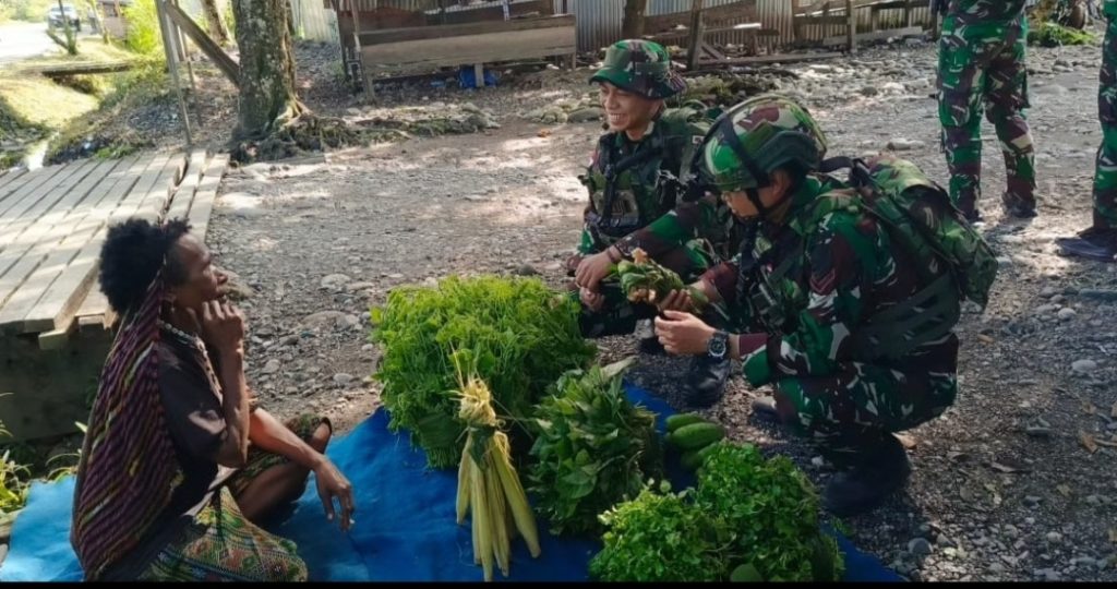 Satgas Yonif 641/Bru Pos Elelim menunjukan bentuk dukungan terhadap petani lokal dengan memborong hasil tani di Pasar Elelim, Distrik Elelim, Kab Yalimo, Papua Pegunungan, (02/08/2024).