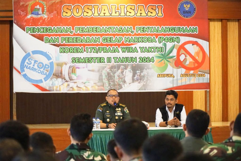 Jayapura – Dalam upaya memperkuat pencegahan dan pemberantasan penyalahgunaan dan peredaran gelap narkoba (P4GN), Korem 172/PWY menggelar sosialisasi semester II tahun 2024, bertempat di Aula Makorem, Abepura, Kota Jayapura, pada Senin (5/8).