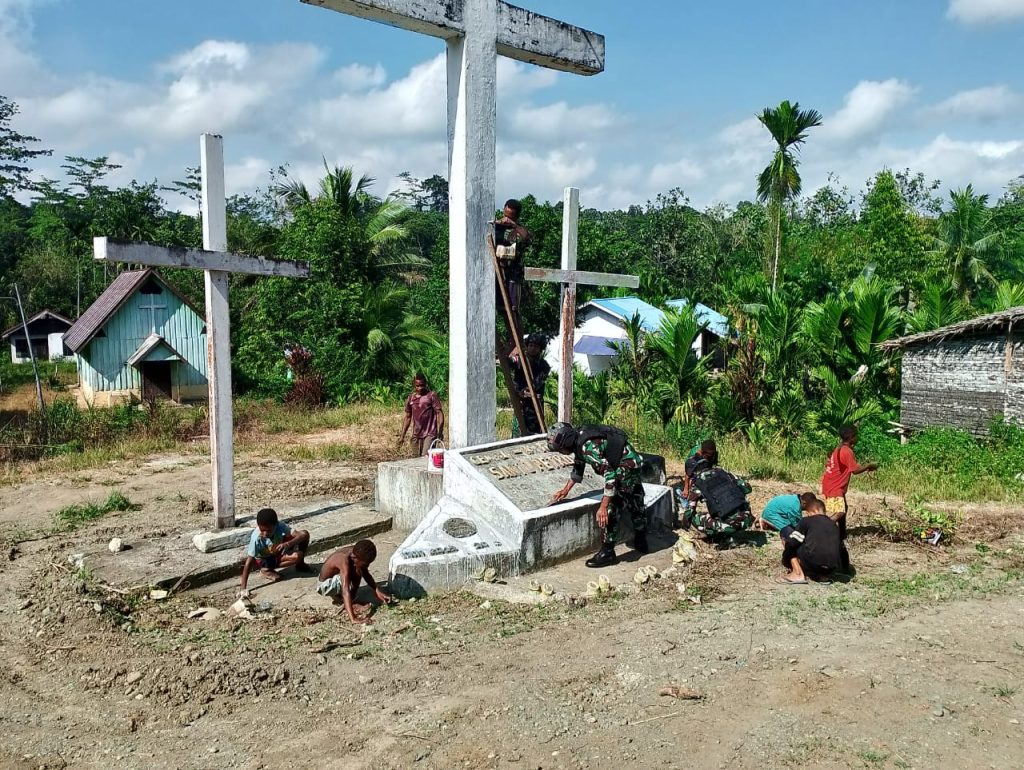 Keerom ~ Dalam rangka percantik dan perindah gereja, Pos Kalipao Satgas Yonif 310/KK bersama warga sekitar lakukan pengecatan dan pembersihan Tugu Salib Gereja Santo Petrus di Kampung Yuwainda, Distrik Waris, Kabupaten Keerom, Papua, Kamis (15/8/2024).