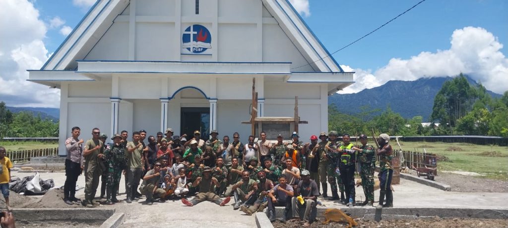 Satgas Yonif 641/Bru Pos Elelim selalu berupaya membangun rasa kebersamaan dan kerjasama yang kuat untuk masyarakat di wilayah Elelim dengan gerak cepat melaksanakan gotong royong/karya bhakti memperbaiki dan potong rumput di sekitar Gereja PBGP Elelim, Distrik Elelim Kabupaten Yalimo, Provinsi Papua Pegunungan, (24/09/2024).