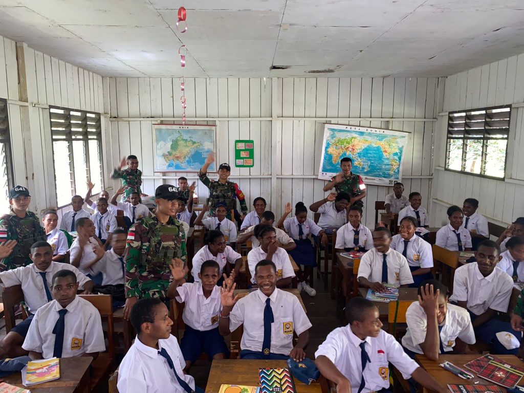 Pos Benawa Satgas Yonif 641/Bru mendukung implementasi program kurikulum merdeka yang dilaksanakan pada proses kegiatan belajar mengajar (KBM) di dunia pendidikan saat ini, Distrik Benawa, Kab. Yalimo, Prov. Papua Pegunungan, (23/09/2024)