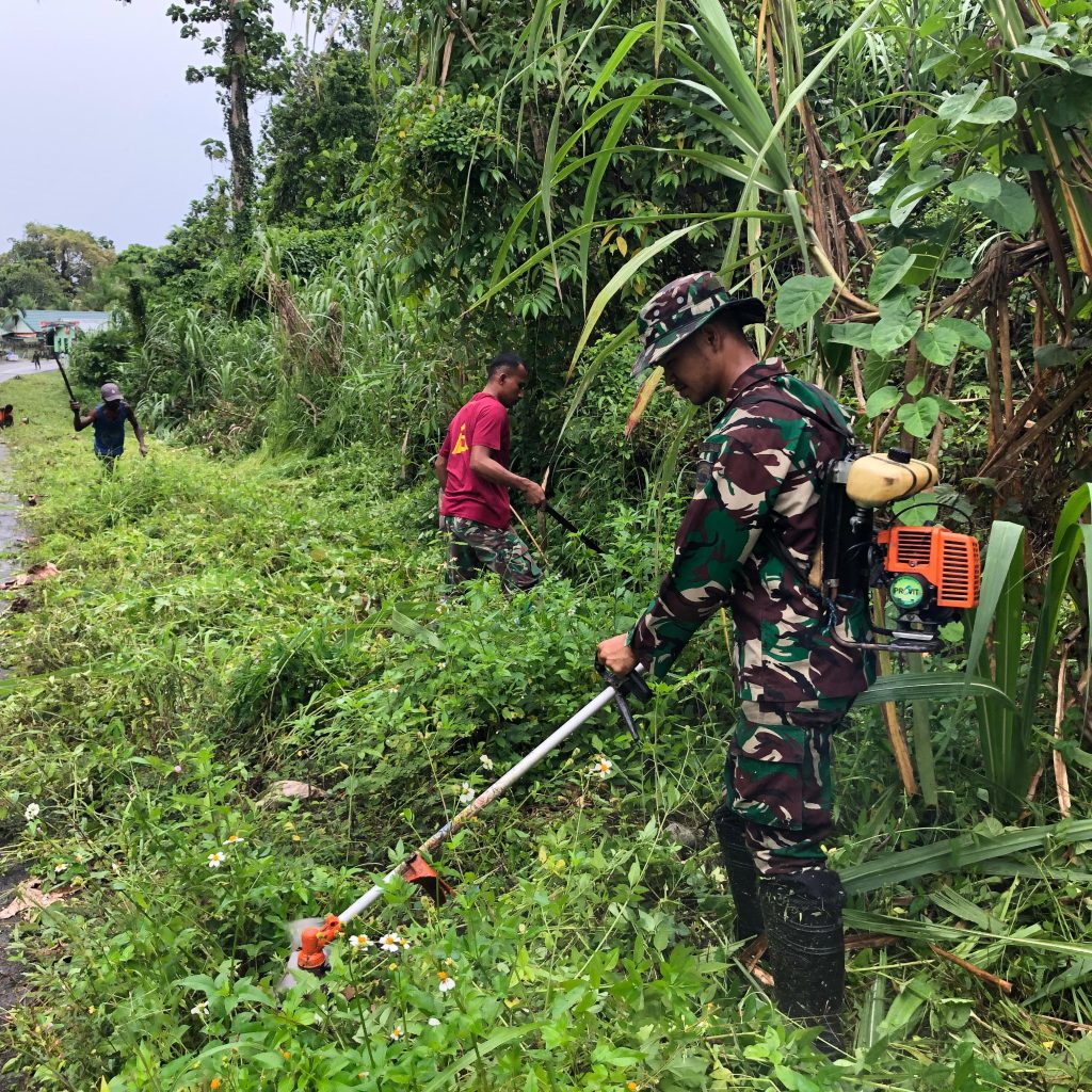 Keerom – Guna menumbuhkan semangat gotong royong dan kebersamaan di lingkungan masyarakat perbatasan. Satgas Yonif 131/BRS, Pos Kalilapar melaksanakan karya bakti pembersihan lingkungan Kampung Sach, Distrik Waris, Kabupaten Keerom, Provinsi Papua, Jum’at, (25/10/2024).