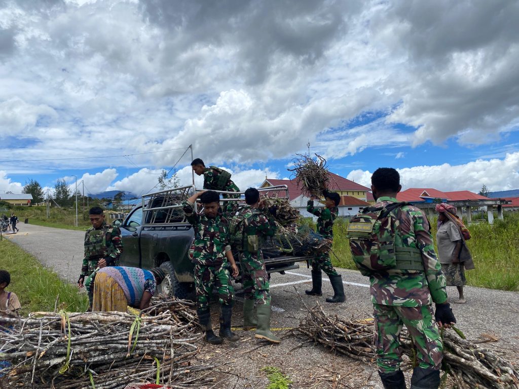 Deiyai,- Satgas Yonif 756/WMS Pos Waghete Baru selalu berupaya membangun rasa kebersamaan dan kerjasama yang kuat untuk masyarakat di wilayah Distrik Tigi dengan gerak cepat melaksanakan gotong royong membantu masyarakat mengangkat kayu bakar di Distrik Tigi Kabupaten Deiyai, Provinsi Papua Tengah, Kamis (10/10/2024).