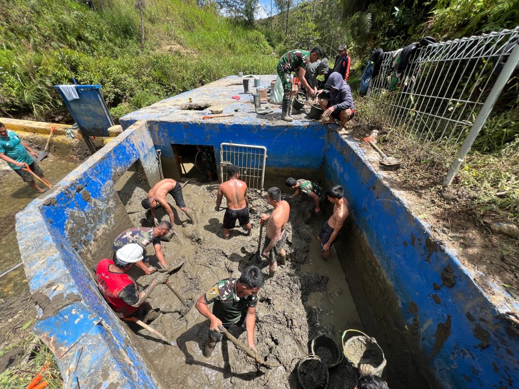 Paniai,- Satgas Pamtas Kewilayahan Yonif 756/WMS membantu masyarakat membersihkan saluran air irigasi Enarotali di Distrik Paniai Timur Kab. Paniai Prov. Papua Tengah, Rabu (09/10/2024).