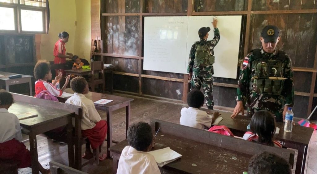 MEMBERAMO RAYA – Satgas Pamtas RI – PNG Kewilayahann Yonif 614/Raja Pandhita Pos Dabra menunjukan semangat tidak pernah layu melakukan pengabdian saat dengan terus mengajar anak-anak di SDN Memberamo Hulu , Distrik Memberamo Hulu, Kabupaten Memberamo Raya, Papua, Jum’at (04/10).