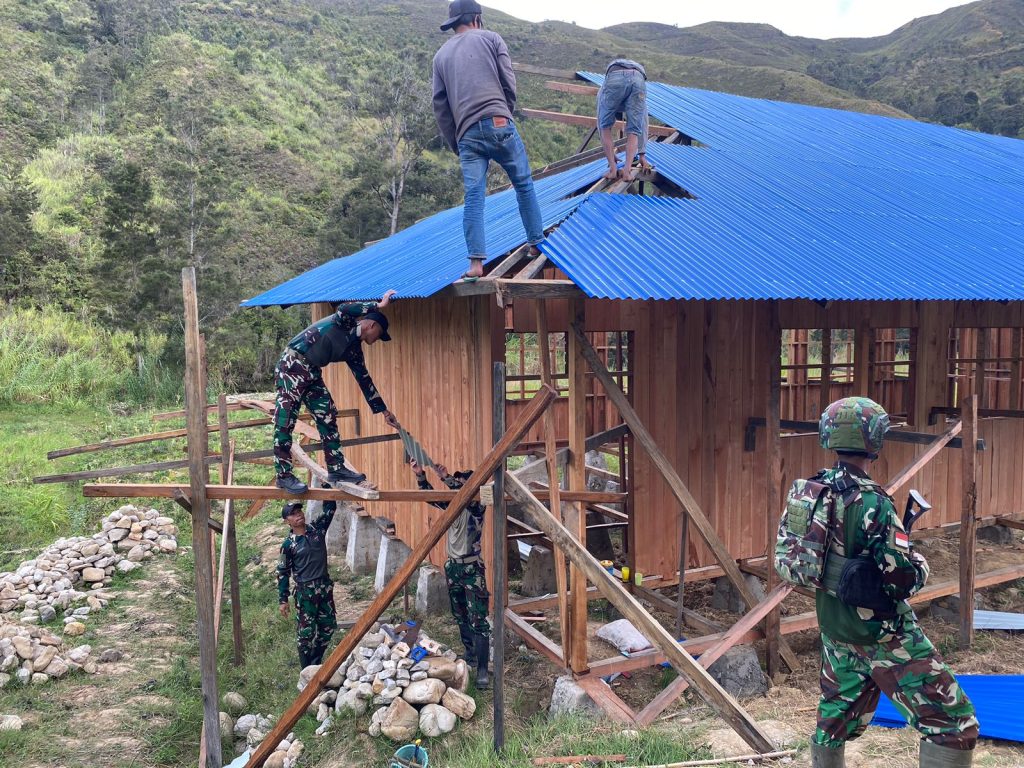 LANNY JAYA – Personel Satgas Yonif 614/Raja Pandhita membantu warga merenovasi Sekolah Menengah pertama Negeri (SMPN) Malagai di Desa Numbokawi, Distrik Malagai, Kabupaten Lanny Jaya, Papua Pegunungan, Kamis (17/10).