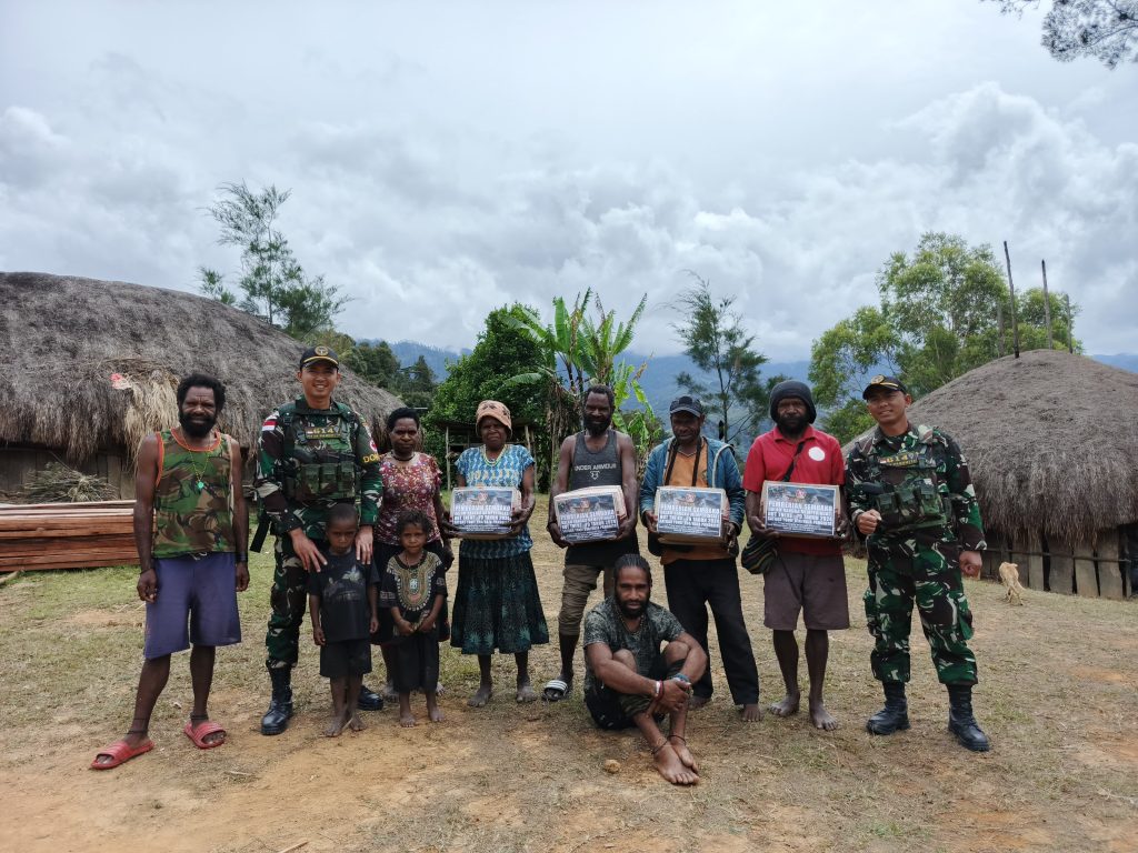 LANNY JAYA – Terpancar keceriaan Masyarakat Ninabua yang bertempat di Distrik Yiginua, Kabupaten Lanny Jaya dalam Rangka memperingati HUT TNI Ke – 79 Satgas Yonif 614/Rjp melaksanakan kegiatan pembagian Paket sembako dan periksa kesehatan untuk masyarakat Kampung Ninabua, Distrik Yiginua, Kabupaten Lanny Jaya, Papua Pegunungan, Sabtu (05/10).