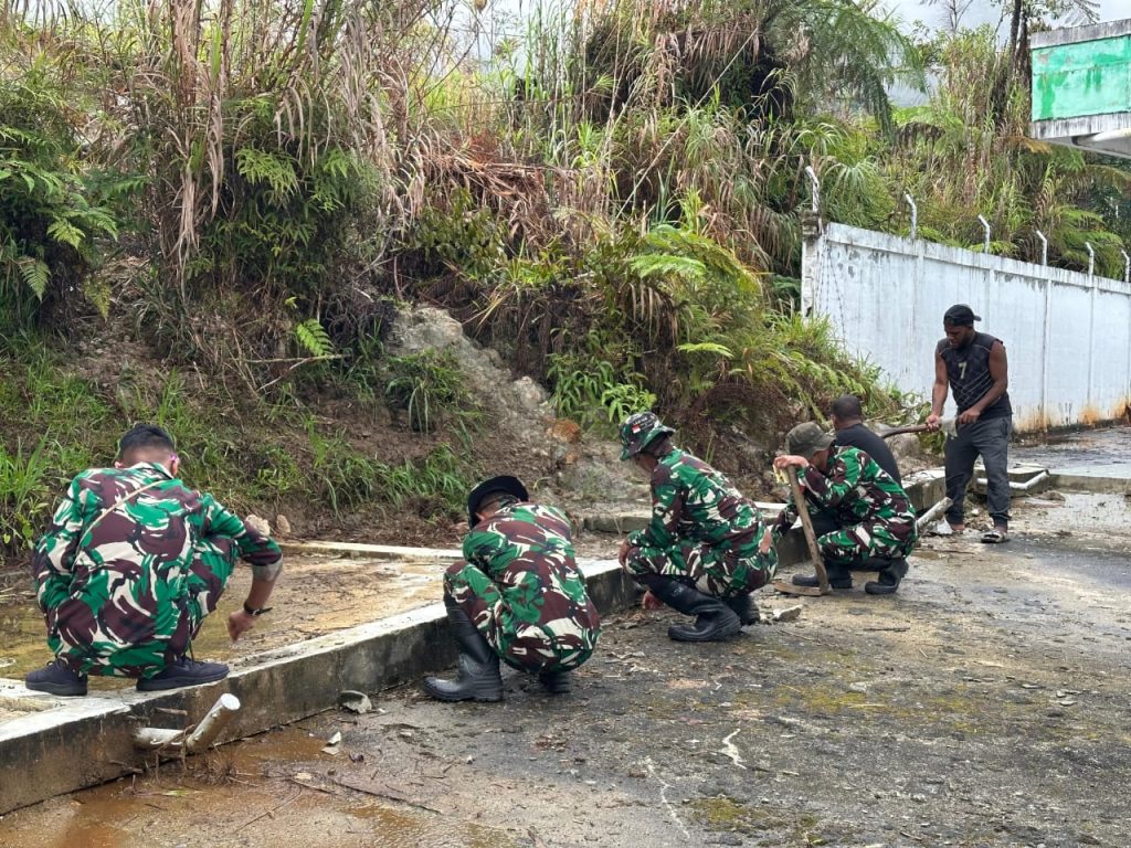 Dogiyai,- Demi menjaga kebersihan sarana kesehatan warga perbatasan, Satgas Yonif 756/WMS bersama masyarakat melaksanakan karya bhakti pembersihan di Puskesmas Distrik Mapia Kab. Dogiyai Provinsi Papua Tengah, Rabu (02/10/2024).