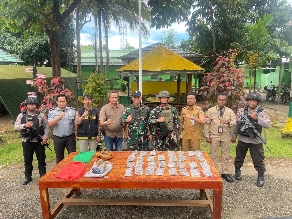 Skouw – Tim Patroli gabungan Pos Kout Satgas Yonif 131/Brs, Pos Polisi Perbatasan RI-PNG dan Bea Cukai serta unsur CIQS berhasil menggagalkan penyelundupan narkotika golongan I jenis ganja kering seberat 1,74 kg di Jln. Perbatasan RI-PNG Skouw, Kp. Mosso, Kec. Muara Tami, Kota Jayapura, Papua, pada Selasa (29/10/2024).