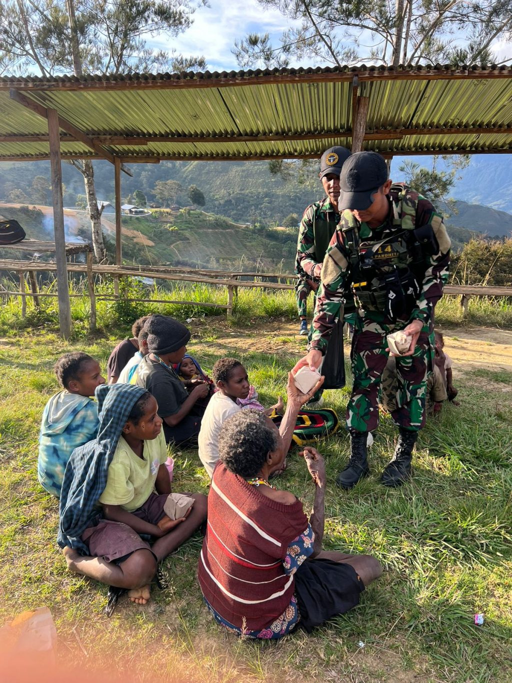 LANNY JAYA – Melalui Kegiatan Binter Satgas Yonif 614/Rjp Pos Popome melaksanakan kegiatan bagi makanan ke warga kampung Popome, Distrik Mokoni, Kabupaten Lanny Jaya, Papua Pegunungan, Sabtu (05/10).