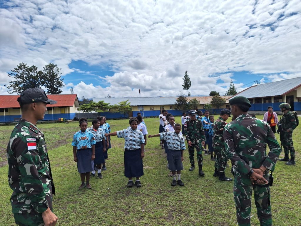 Jaya Wijaya — Satgas Yonif 641/Beruang melalui Pos Napua meningkatkan kedisiplinan murid dengan mengajarkan PBB (Peraturan Baris Berbaris) kepada siswa dan siswi SMP YPPGI ANIGOU, Distrik Napua, Kab. Jayawijaya, Prov. Papua Pegunungan. (08/10/2024).