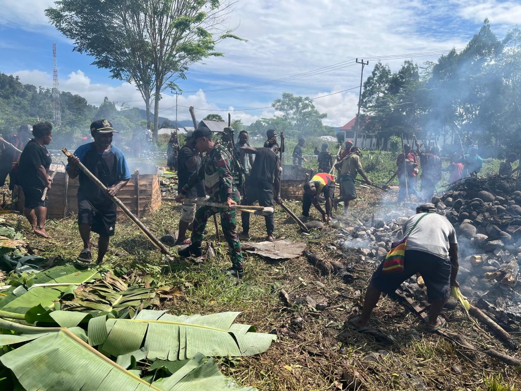 Satgas Yonif 641/Beruang semakin dekat dan akrab dengan warga dalam rangka menghadiri pelantikan PGRI acara syukuran bakar batu di Distrik Elelim, Kabupaten Yalimo, Provinsi Papua Pegunungan, (04/11/2024).