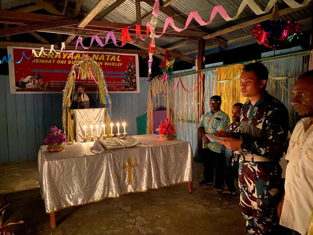 Senggi, Kabupaten Keerom, Papua – Dalam rangka menyemarakkan masih dalam suasana Natal, Anggota Pos Kout Satgas Yonif 512/QY menunjukkan semangat persatuan dan toleransi dengan turut serta dalam doa bersama yang diadakan di beberapa gereja di Distrik Senggi. Kegiatan ini melibatkan seluruh elemen masyarakat setempat serta anggota TNI dari Pos Kout Satgas Yonif 512/QY sebagai bentuk dukungan terhadap kemaslahatan bersama. Sabtu, (28/12/2024).