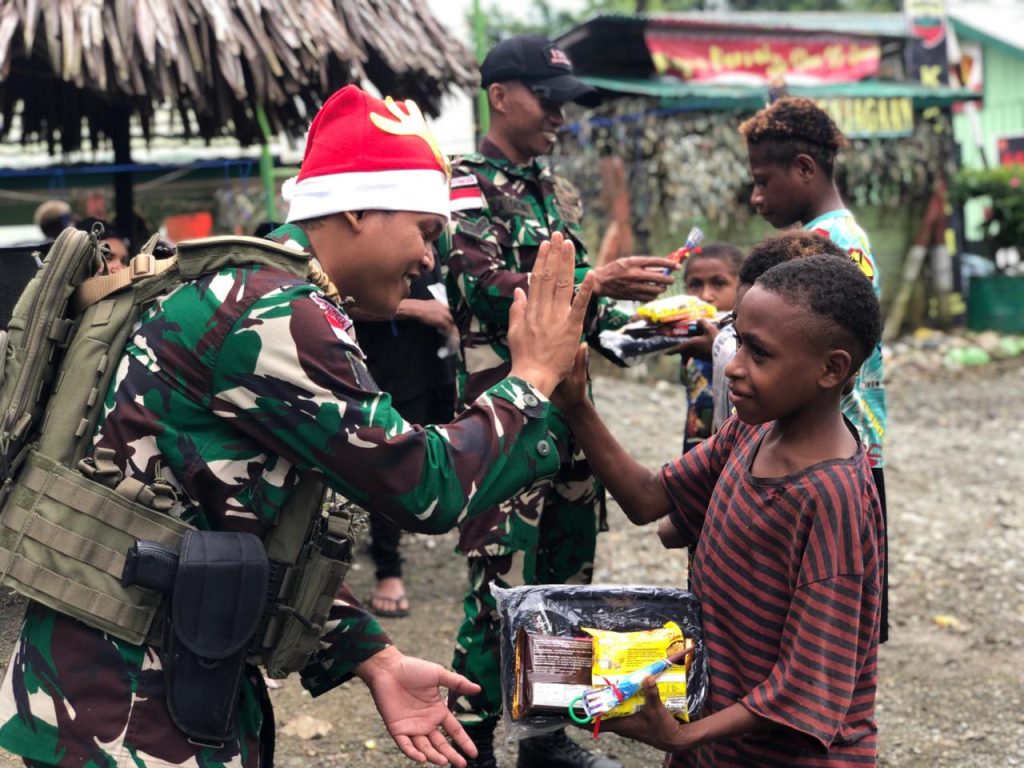 Kab. Keerom ~ Dalam rangka memeriahkan Hari Natal dan menyambut Tahun Baru 2025, Satgas Yonif 131/BRS Pos Kalilapar mengadakan perlombaan panjat pohon pinang dan makan kerupuk kepada anak-anak Kampung Kali Lapar, Distrik Mannem, Kab. Keerom, Papua, Jum’at (27/12/2024).