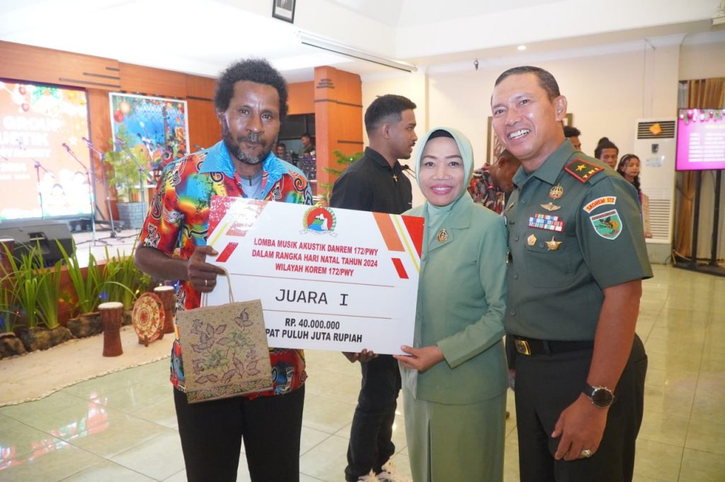 Abepura Jayapura – Danrem 172/Praja Wira Yakthi (PWY) Brigjen TNI Dedi Hardono, S.I.P yang didampingi Ketua Persit KCK Koorcabrem 172/PWY Ny. Seri Dedi Hardono, para pejabat Korem 172/PWY dan Pendeta Umbu Akwan menyaksikan perlombaan Vocal Group dan Musik Akustik lagu-lagu Natal, dimana kegiatan ini telah berlangsung selama 2 hari yang dimulai dari tanggal 17 sampai dengan 18 Desember 2024 di Aula Makorem 172/PWY, Rabu (18/12/2024).
