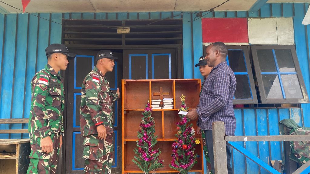 Pos Eragayam Satgas Pamtas Kewilayahan Yonif 641/ Bru memberikan Pohon Natal, Lemari dan Alkitab untuk Gereja Lobi Eragayam, Distrik Eragayam, Kabupaten Membramo Tengah, Provinsi Papua Pergunungan, (25/12/2024).