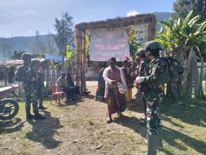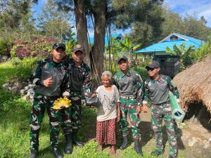 LANNY JAYA - Personel Pos Pirime Satgas Yonif 614/Raja Pandhita Prajurit membagikan paket sembako dan tikar kepada warga perbatasan papua...
