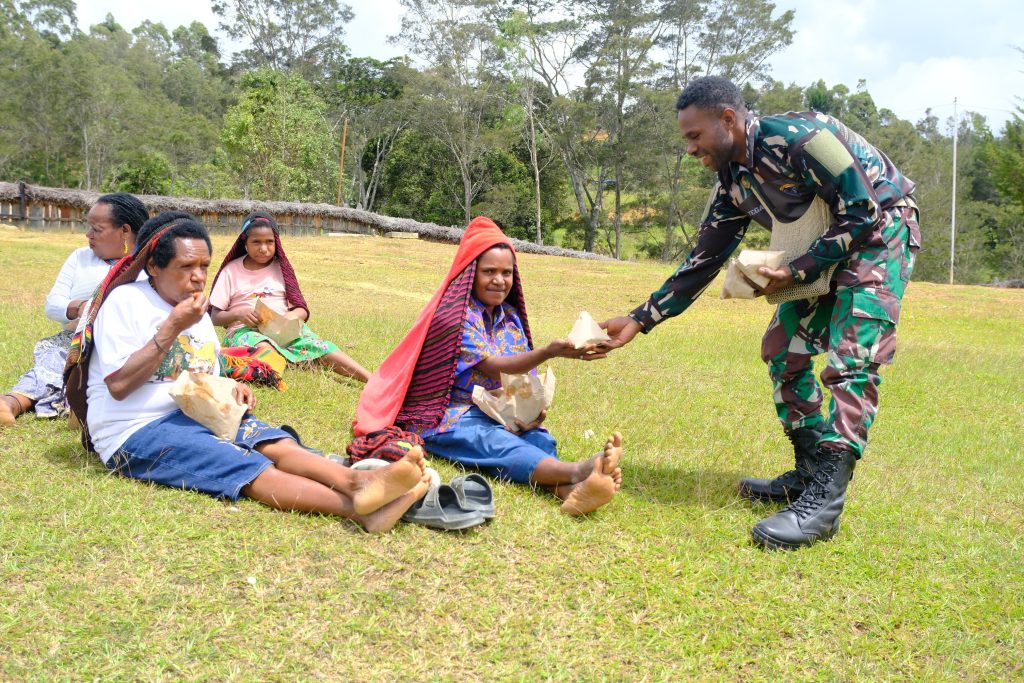 LANNY JAYA – Pos Tiom (Kotis) Satgas Yonif 614/RJP bagikan 150 Nasi Bungkus kepada jemaat Gereja Kogoyaluk yang bertempat di Kampung Konikme, Distrik Yugungwi, Kabupaten Lanny Jaya, Papua Pegunungan, Minggu (29/12/2024).