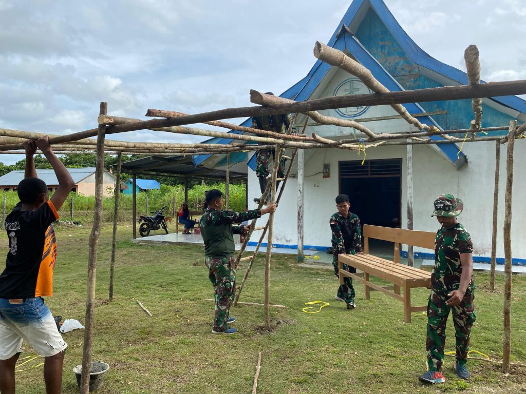 Senggi, Kabupaten Keerom, Papua – Dalam rangka menyambut perayaan Natal yang penuh damai dan penuh makna, Pos Kout Satgas Yonif 512/QY turut berperan aktif dalam mempersiapkan kegiatan Natal di Gereja Kemah Injil Indonesia, yang terletak di Distrik Senggi. Sabtu, (21/12/2024).