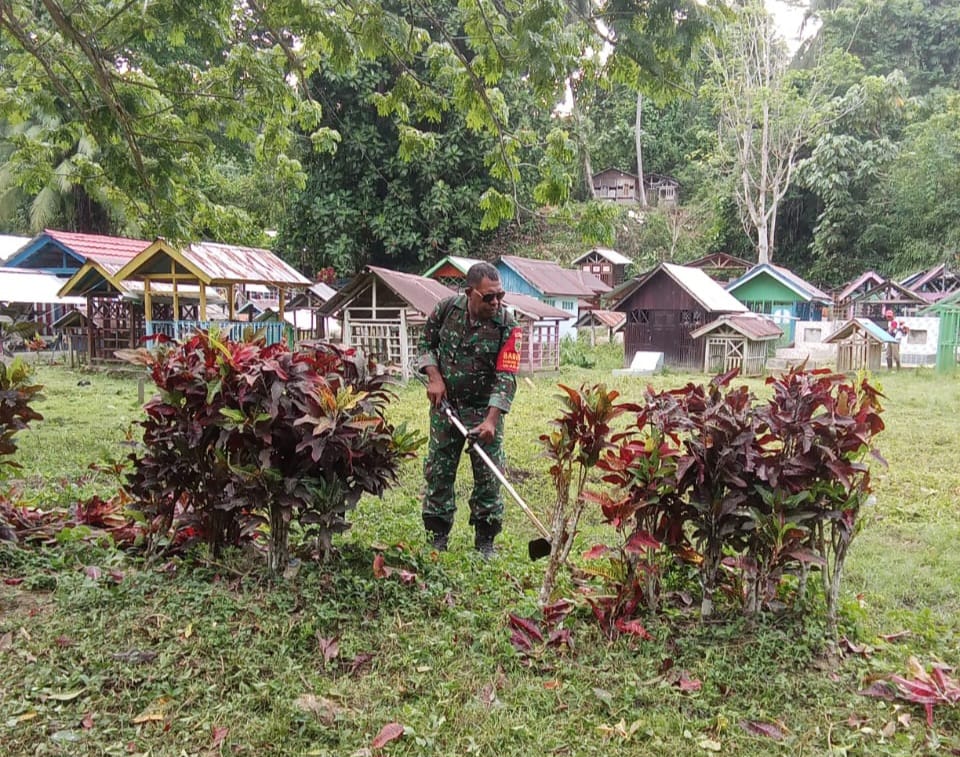 Waropen – Guna memelihara keindahan dan kebersihan lingkungan pemakaman umum yang ada diwilayah binaannya, Serka Sakeus Ayomi Babinsa Koramil 1709-03/Waropen Bawah Kodim 1709/Yawa, bersama warganya bergotong-royong melaksanakan pembersihan pekarangan TPU (Tempat Pemakaman Umum) yang berada di Kampung Sarafambai, Distrik Waropen Bawah, Kabupaten Waropen, Jumat (03/01/2024).