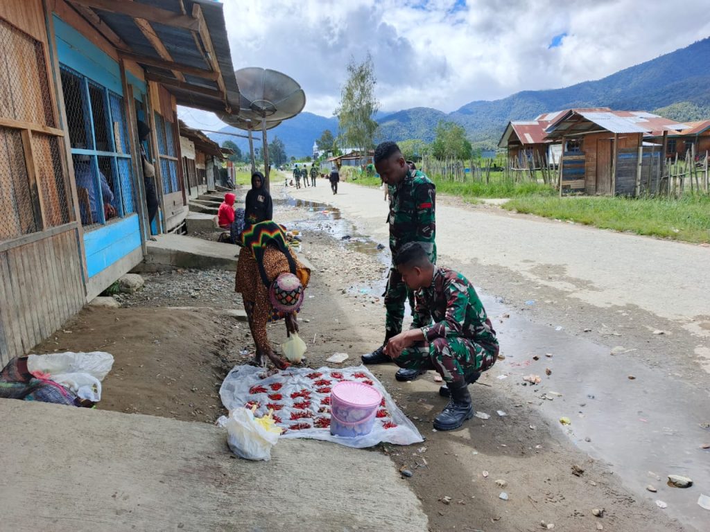 Paniai,- Satgas Pamtas Kewilayahan Yonif 756/WMS personel Pos Obano membantu menggerakkan roda pertumbuhan perekonomian warga Distrik Obano dengan memborong hasil tani yang dijual di sekitar jalan Distrik Obano, Kabupaten Paniai, Provinsi Papua Tengah, Selasa (31/12/2024).