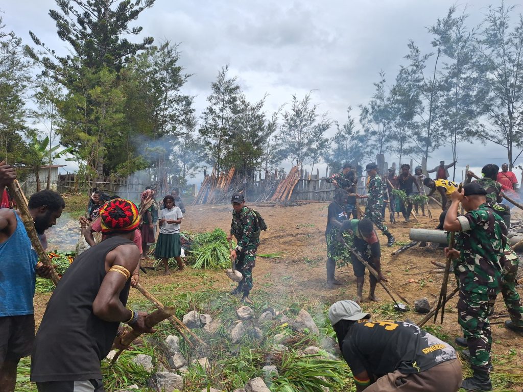 Dipimpin langsung Danpos Napua Kapten Inf I Komang Agus Suratmaja beserta beberapa orang anggota yang beragama Nasrani menghadiri undangan dari warga Gereja Kemah Injil (Kingmi) untuk mengikuti acara adat bakar batu dalam rangka merayakan Hari Natal bersama dan menyambut tahun baru 2025.