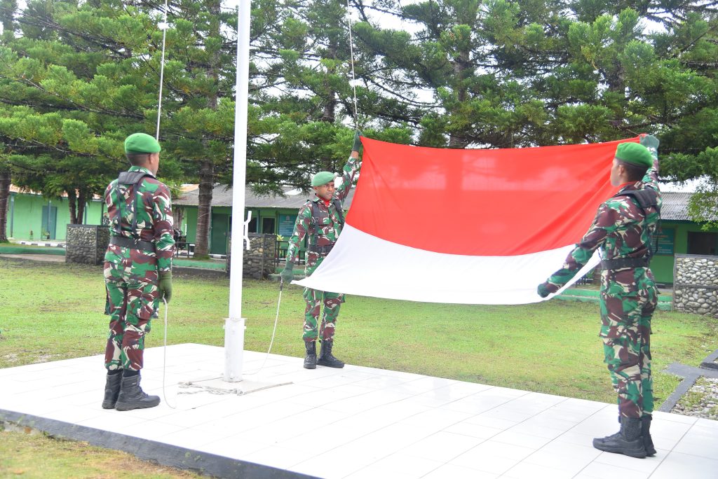 Wamena – Danramil 1702-01/Wamena Mayor Inf Aprin Paembonan, memimpin upacara bendera yang digelar di halaman Markas Kodim 1702/ Jayawijaya, Jln. Yos Sudarso, Distrik Wamena, Kab. Jayawijaya, Prov. Papua Pegunungan, Senin (30/12/2024).