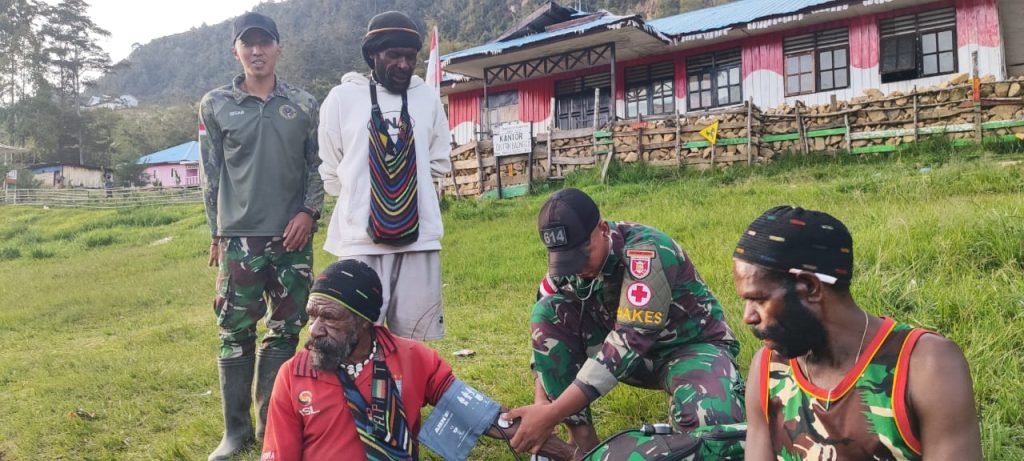 LANNY JAYA – Bertempat Desa Balingga, Distrik Balingga, Kabupaten Lanny Jaya, Papua Pegunungan, Pos Balingga Satgas Yonif 614/RJP turut menyukseskan program pemerintah dalam bidang kesehatan dengan memberikan pelayanan kesehatan gratis kepada warga setempat, Sabtu (04/1/2025).