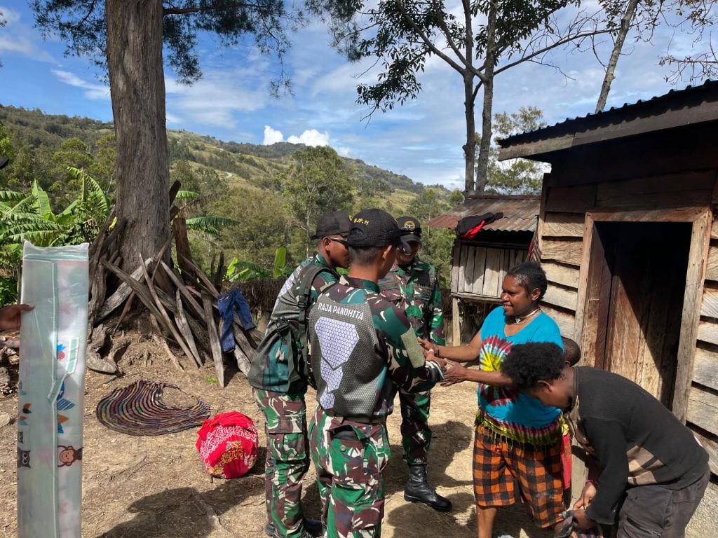 LANNY JAYA – Wujud solidaritas dan kepedulian terhadap masyarakat di perbatasan Papua, Pos Pirime Satgas Pamtas RI-PNG Kewilayahan Yonif 614/RJP melaksanakan anjangsana ke Honai – Honai warga binaan sekaligus membagikan sembako dan Karpet yang bertempat di Desa Ekanom, Distrik Pirime, Kabupaten Lanny Jaya, Papua Pegunungan.