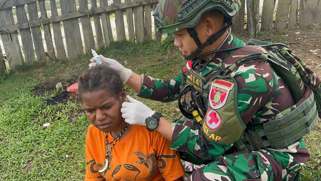 TOLIKARA – Personil Satgas Yonif 614/RJP Pos Karubaga melaksanakan kegiatan Anjangsana sekaligus memberikan Pelayanan Pengobatan Gratis kepada masyarakat di Jalan Irian, Desa Elsaday, Distrik Karubaga, Kabupaten Tolikara, Papua Pegunungan, Selasa (25/2/2025).