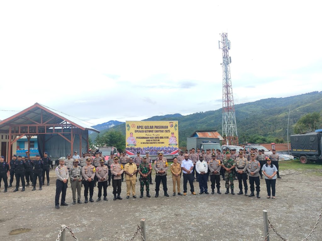 Karubaga, Dandim 1716/Tolikara Letkol Inf Justus Bernard Mara, S.Sos, M.I.P mengikuti kegiatan Apel Gelar Pasukan Operasi Ketupat Cartensz Dalam Rangka Pengamanan Hari Raya Iedul Fitri 1446 H/ 2025 M. Bertempat di Mapolres Tolikara Jln. Ampera Distrik Karubaga Kab Tolikara Prov Papua Pegunungan ( Kamis, 20 Maret 2025 )