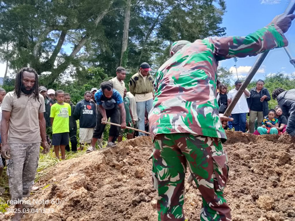 Wamena – Sebagai wujud kepedulian dan kebersamaan dengan masyarakat, anggota Babinsa Koramil 1702-03/Kurulu melaksanakan kegiatan komunikasi sosial (Komsos) dan memberikan bantuan untuk membantu proses pemakaman almarhumah Mama Mina Merani, istri dari Purn PNS Dominikus Mabel bertempat di Kampung Yiwika Distrik Kurulu Kabupaten Jayawijaya. Selasa (04/03/2025).