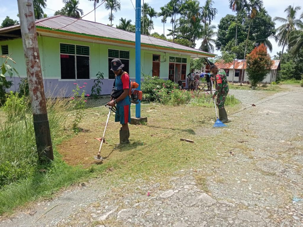 Serui – Menjadi motivator dan penggerak masyarakat binaannya untuk peduli terhadap kebersihan lingkungan, Kopda Romelus Karowa Babinsa Koramil 1709-01/Serui Kodim 1709/Yawa, bersama-sama warga binaannya bergotong-royong melakukan pembersihan lingkungan yang berada disepanjang jalan di Kampung Tatui, Distrik Kosiwo, Kabupaten Kepulauan Yapen, Sabtu (08/03/2025).