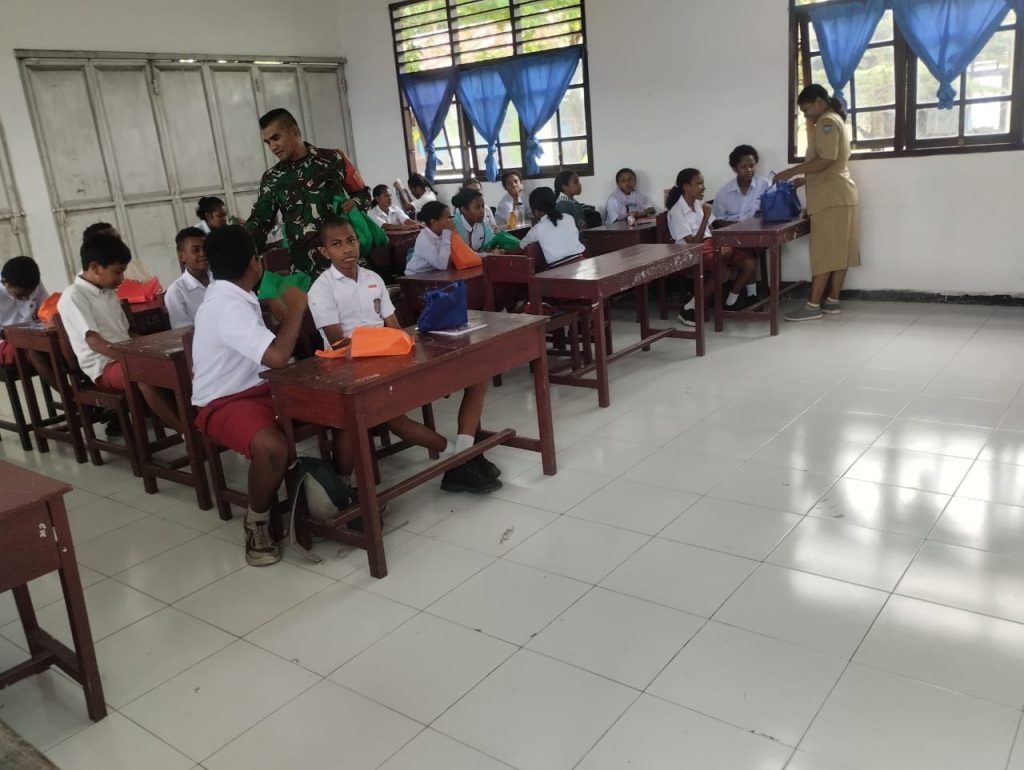 Serui – Para Babinsa Koramil 1709-01/Serui Kodim 1709/Yawa setiap harinya terus proaktif mendukung Kesuksesan Program Makan Bergizi Gratis (MBG) dengan melakukan pendampingan pendistribusian kepada seluruh pelajar ditingkat SD yang ada diwilayah Distrik Yapen Selatan, Kabupaten Kepulauan Yapen, Senin (10/03/2025).