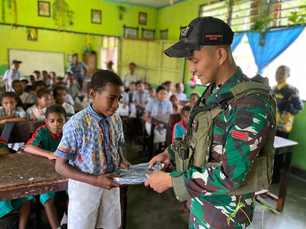 Kab. Keerom- Meningkatnya semangat belajar dan cinta kepada anak-anak di perbatasan, Satgas Pamtas RI-PNG Yonif 131/BRS berikan dukungan perlengkapan Sekolah untuk Siswa/i anak didik SD YPPK Wembi yang bertempat di Kampung Piawi, Distrik Mannem, Provinsi Papua, Jum’at (28/02/2025).
