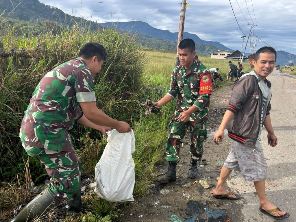 Dogiyai,- Ciptakan lingkungan yang bersih, Satuan Tugas Pengamanan Perbatasan Kewilayahan Batalyon Infanteri 756/WMS membangun rasa kebersamaan dan kepercayaan dengan melaksanakan karya bhakti wilayah binaan Pos Mapiai tepatnya di jalan Distrik Mapia, Kab. Dogiyai Provinsi Papua Tengah, Rabu (05/03/2025).