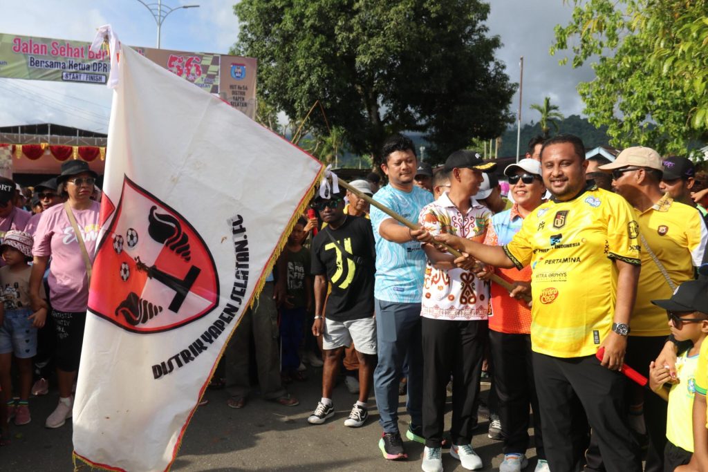 Serui – Dalam rangka memperingati HUT ke-56 Distrik Yapen Selatan, Komandan Kodim 1709/Yawa Letkol Inf Baskoro Wijaya Atmanto, S.E, bersama seluruh prajuritnya mengikuti kegiatan Jalan Santai yang berlokasi di Halaman Kantor Distrik Yapen Selatan, Jl. Hassanudin, Kabupaten Kepulauan Yapen, Jumat (07/03/2025).
