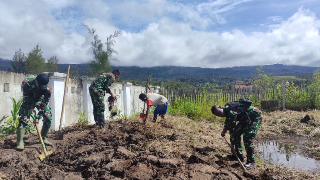 Paniai,- Di Kampung Dama-dama, Distrik Bibida, Kabupaten Paniai Provinsi Papua Tengah, Satgas Yonif 756/WMS melalui Pos Bibida melaksanakan Komsos yang dipimpin oleh Wadanpos Serka Gede dalam rangka membantu dan mendampingi petani untuk mengolah lahan pertanian untuk bercocok tanam, Jumat (28/02/2025).