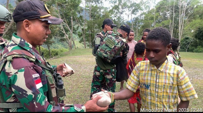 Tolikara – Dalam rangka mendukung program Pemerintah, terkait pemberian makanan sehat dan bergizi, Satgas Yonif 614/Raja Pandhita melaksanakan kegiatan sosial dengan membagikan makanan sehat dan bergizi kepada jemaat Gereja Eklesia di Kampung Laor, Distrik Kanggime, Kabupaten Tolikara, Minggu (02/3/2025).