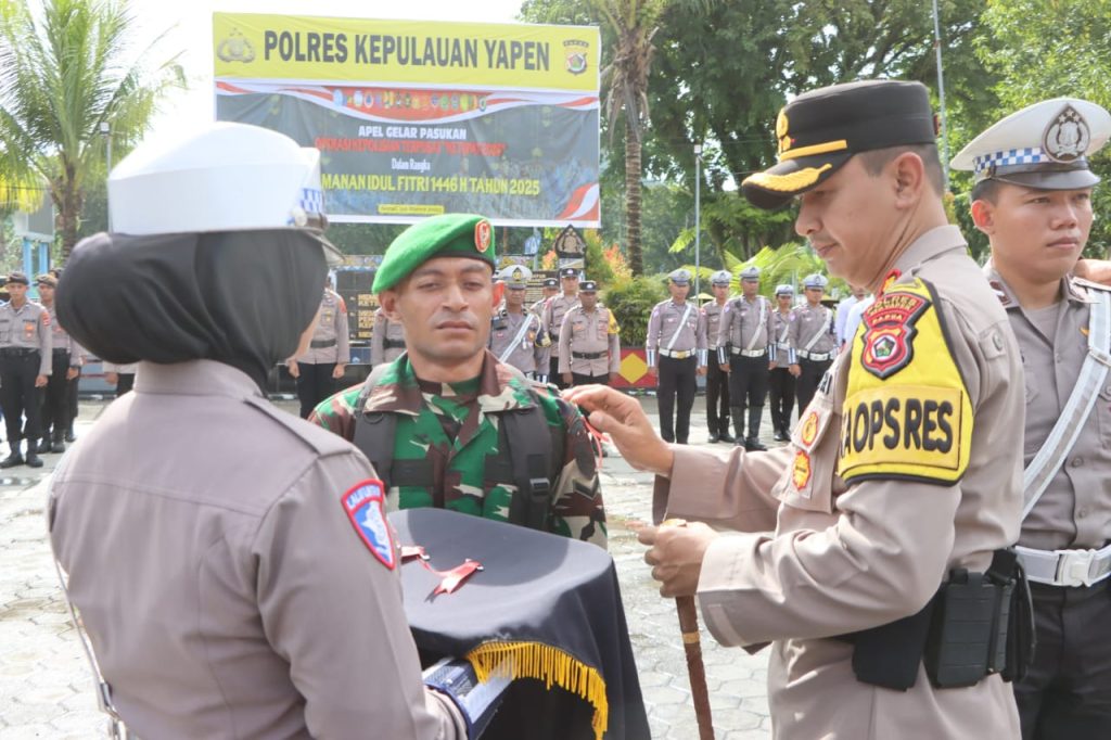 Serui – Dalam rangka mendukung pelaksanaan Pengamanan Hari Raya Idul Fitri 1446 H/2025 M diwilayah teritorialnya, Komandan Kodim 1709/Yawa Letkol Inf Baskoro Wijaya Atmanto, SE, bersama 1 SST (Satuan setingkat peleton) personelnya, mengikuti Apel Gelar Pasukan Operasi Ketupat Cartenz Pengamanan Idul Fitri Tahun 2025, yang berlokasi dilapangan Polres Yapen, Distrik Yapen Selatan, Kabupaten Kepulauan Yapen, Kamis (20/03/2025).