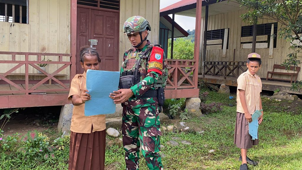 Dalam membangun rasa kebersamaan dan kepedulian terhadap usia dini, personel Pos Kout Elelim mengajarkan PBB (Peraturan baris berbaris) dan cara mengibarkan Bendera pada saat upacara Hari senin kepada siswa dan siswi SDN 1 Elelim, Distrik Elelim, Kabupaten Yalimo, Provinsi Papua Pegunungan, (08/02/2025)