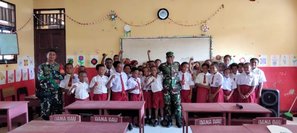 Waren – Sebagai upaya Aparat Teritorial dalam meningkatkan minat generasi muda diwilayah binaannya terhadap pelajaran matematika, Sertu Rendi Imbiri dan Serda Tuwuri Worabai Babinsa Koramil 1709-03/Waropen Bawah Kodim 1709/Yawa, hadir di SD YPK Betania Waren, Distrik Waropen Bawah, Kabupaten Waropen, untuk memberikan Pembelajaran Materi Matematika Metode Gasing (Gampang, Asyik dan Menyenangkan), Senin (10/03/2025).