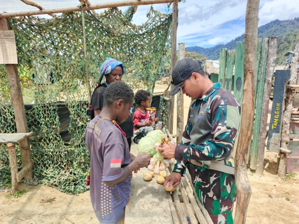 Demi meningkatkan kesejahteraan masyarakat, kegiatan teritorial Satgas Yonif 614/RJP tak pernah berhenti dilaksanakan. Kali ini dengan memborong hasil bumi mama Papua yang jualan di dekat Pos Popome.