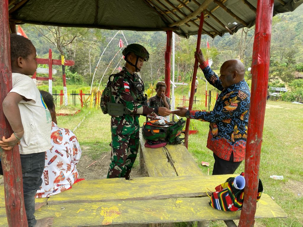 LANNY JAYA – Satgas Yonif 614/RJP melaksanakan layanan kesehatan gratis guna meningkatkan kualitas kesehatan masyarakat di Kampung Tima, Distrik Balingga, Kabupaten Lanny Jaya, Senin (10/3/2025).