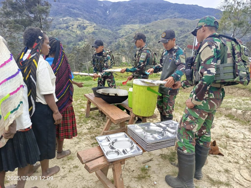 LANNY JAYA – Alhamdulillah, dengan kesederhanaan, di Minggu ke 34 kali ini, Personel Satgas Yonif 614/RJP Pos Tima kembali membantu masyarakat, dengan melaksanakan Kegiatan Teritorial, Memberikan Makan Bergizi Gratis ( MBG ) Kepada Masyarakat yang ada disekitaran Pos Tima Desa Tima, Distrik Balingga, Kab. Lanny Jaya, Papua Pegunungan, Minggu (09/3/2025).