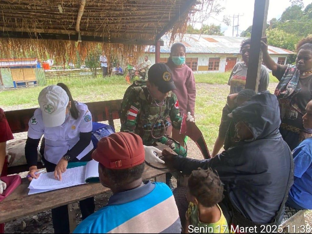 TOLIKARA – Guna membantu pemerintah dalam peningkatan kesehatan masyarakat Papua, Personel Pos Kanggime Satgas Yonif 614/RJP bersama petugas Puskesmas Kanggime gelar pelayanan kesehatan gratis kepada masyarakat Kampung Kanggime, Distrik Kanggime, Kabupaten Tolikara, Papua Pegunungan, Senin (17/3/2025).