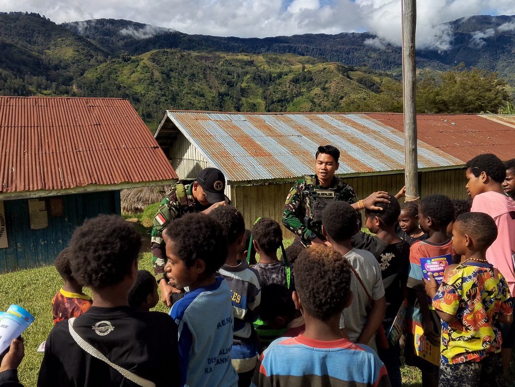 LANNY JAYA – Satgas Yonif 614/RJP dari Pos Karubaga membantu pemerintah daerah dalam memberikan tambahan ilmu pengetahuan dengan materi wawasan kebangsaan dan cinta tanah air di SD Impres Brume, Kampung Brume, Distrik Balingga, Kabupaten Lanny Jaya, Papua Pegunungan, Kamis (20/3/2025)