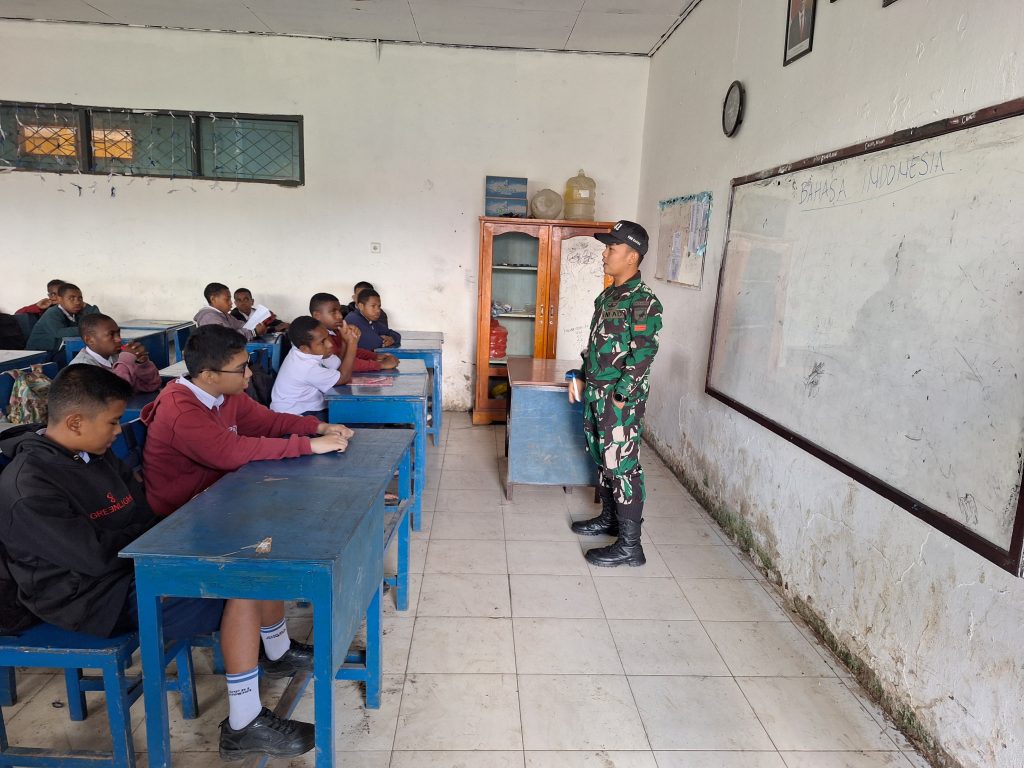 Menanamkan semangat belajar, Personel Pos Napua Satgas Yonif 641/Bru memberikan materi pembelajaran dalam membangun rasa kebersamaan dan kepedulian terhadap siswa dan siswi SMP Negeri 1 Wamena yang berada di Jl.SD Percobaan, Wamena kota, Distrik Wamena, Kabupaten Jayawijaya, Papua Pegunungan, (17/03/2025)
