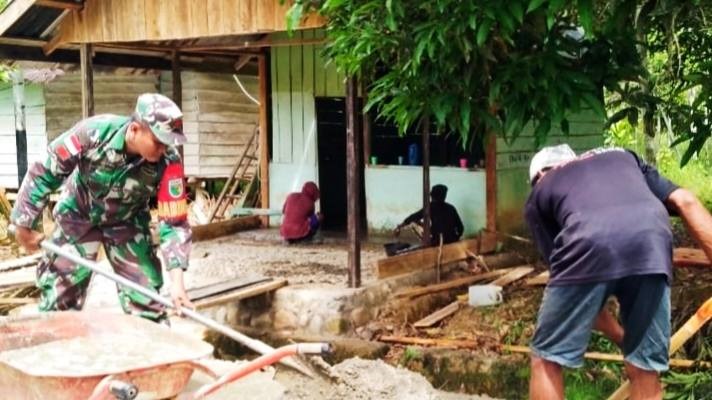 Sebelumnya memiliki lantai yang belum permanen dan sering mengalami kerusakan, sehingga menyulitkan penghuninya. Melihat kondisi tersebut, Babinsa bersama warga setempat bergotong-royong untuk melakukan pengecoran lantai rumah.